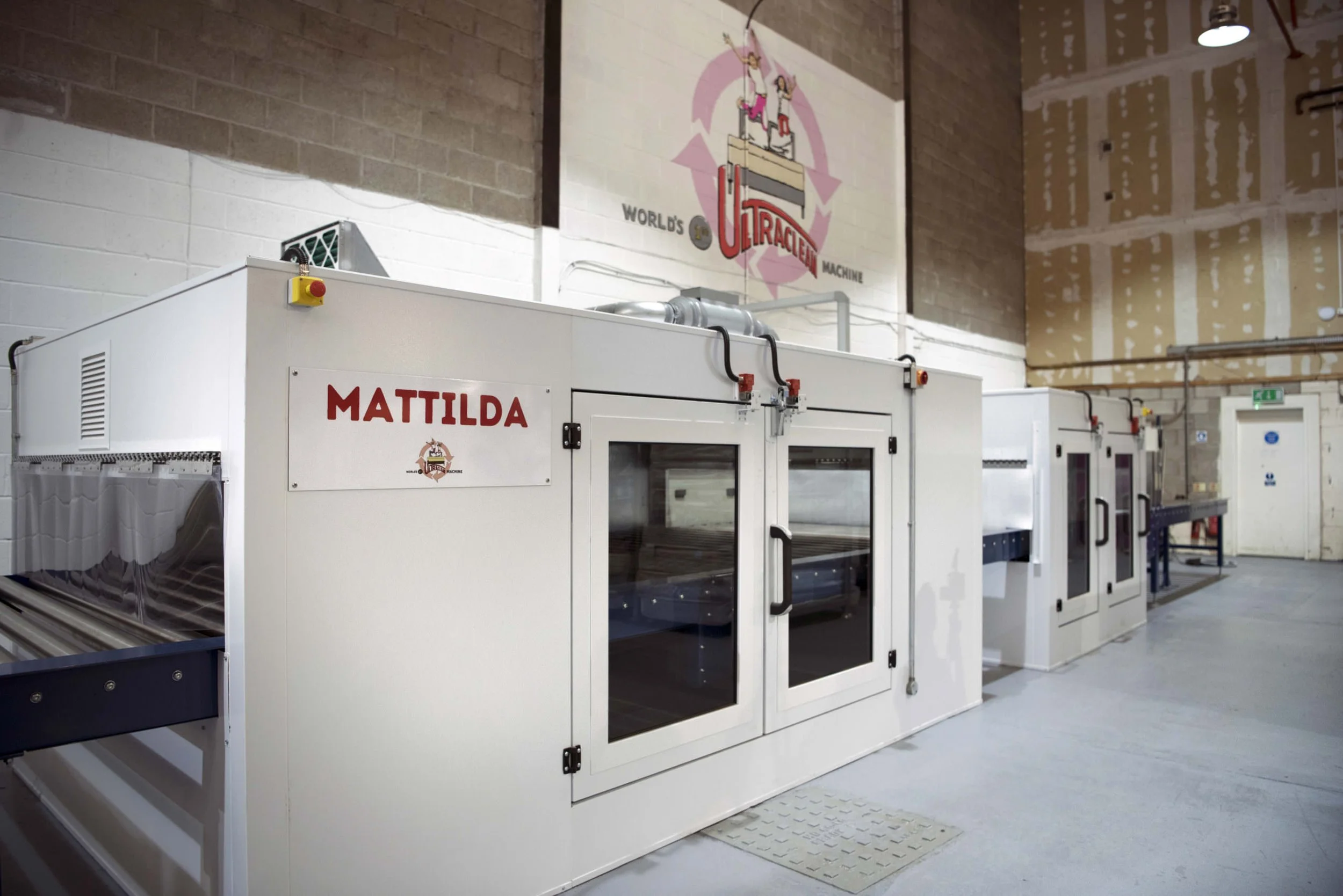 Mattilda, the world’s first mattress cleaning machine for Liverpool’s FRC Group. An 18m long system for delivering UltraClean® mattresses back into use with restored flame retardancy. Mattilda won a National Recycling award and an LCR Innovation award.